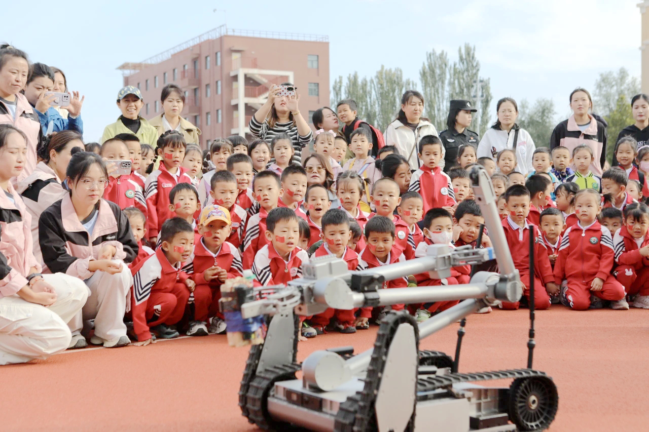 訓(xùn)練場上,特警隊員以雷霆之勢亮相,警棍盾牌剛勁有力、戰(zhàn)術(shù)槍操虎虎生風(fēng)、應(yīng)用射擊百發(fā)百中,無人機(jī)騰空而起完成低空偵察模擬,警犬亮相開展搜爆撲咬,孩子們歡呼雀躍,不停模仿特警叔叔的“戰(zhàn)斗姿勢”,童趣場景活力滿滿。
