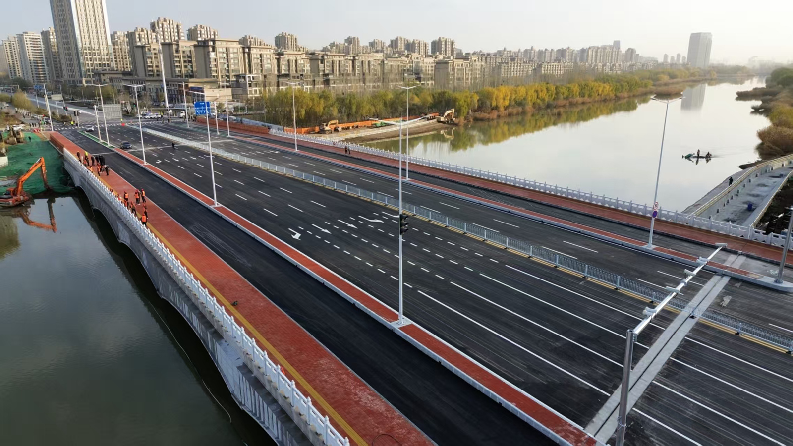 項目南起上海路,北至濱河路,其中橋梁全長127米,橋?qū)?0米,為裝配式預(yù)應(yīng)力混凝土空心板橋,橋面道路“人車分離、各行其道”,設(shè)雙向8車道并單獨設(shè)置公交車專用道和人行道,兼具交通分流與城市景觀功能。