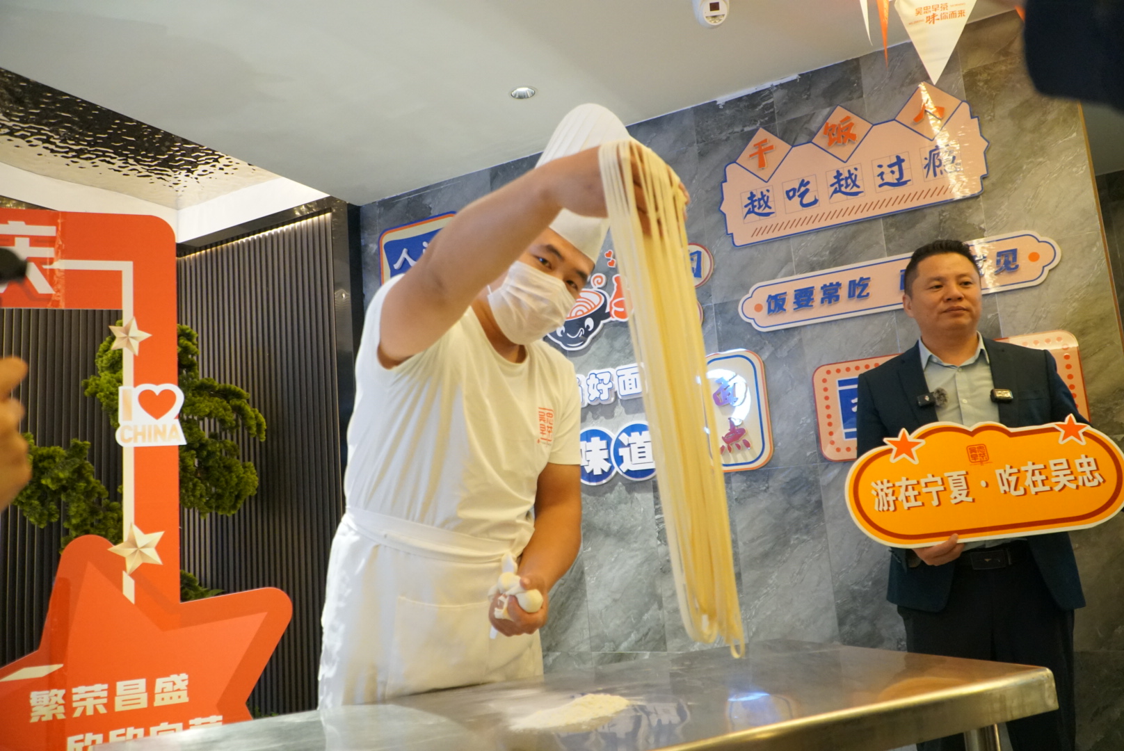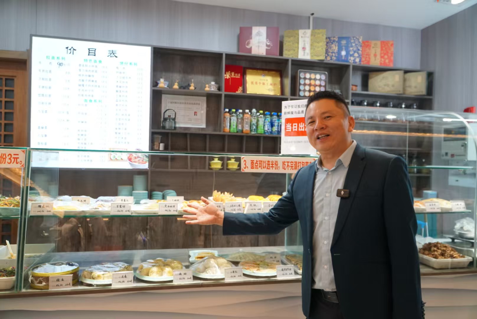 在吳忠利通區(qū)食名軒早茶店內(nèi),采訪團(tuán)被店長(zhǎng)吳濤表演的早茶快板深深吸引。他語(yǔ)調(diào)舒緩有致,語(yǔ)音高低頓挫地向來(lái)客介紹店內(nèi)的鎮(zhèn)寶美食:“八寶茶、八寶粥、八寶飯,紅豆包、紅豆餅、紅豆酥,梅花酥、板栗酥、榴蓮酥、千層烤酥,鍋貼、燒賣、小籠包,糖糕、油條、牛角包,馓子、油香、蜜豆包,煎餃、蛋撻、核桃包,韭菜合子、紫薯包,湯面油香、烤包子……”店內(nèi)的顧客為吳濤的表演送上了熱烈的掌聲。