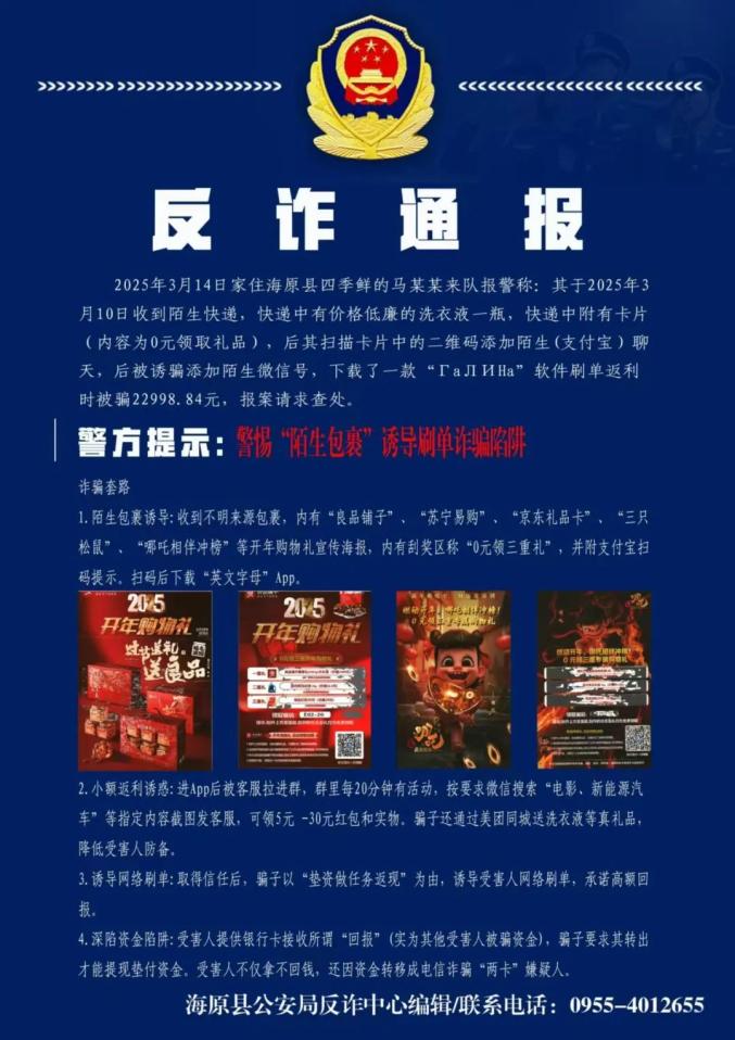 近期,利用快遞渠道郵寄“三只松鼠”“良品鋪子”等掃碼中獎傳單的詐騙方式多發(fā)高發(fā),在刑偵總隊和市局偵查中心的緊急統(tǒng)籌指揮下,海原縣公安局反詐中心積極響應、主動作為、連續(xù)作戰(zhàn),成功攔截尚未送達的“詐騙快遞”1000余份,最大限度保護群眾的財產安全。