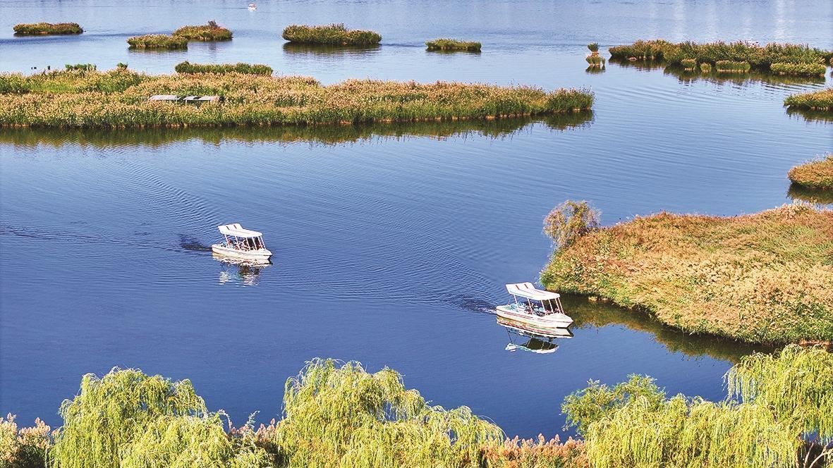 游人乘船緩緩前行,享受初秋的浪漫。